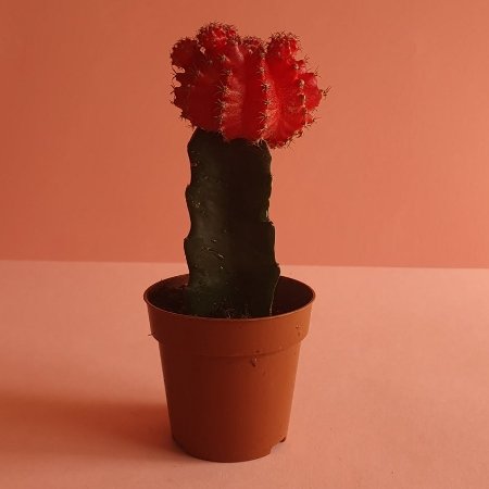 Red Moon Cactus (Pot 10 cm) is a striking ornamental cactus known for its bold, bright red top grafted onto a green base cactus. Compact and low-maintenance, it thrives in bright, indirect light and requires minimal watering. Ideal for desks, shelves, and indoor displays, this colorful cactus adds a cheerful and unique touch to any space.